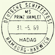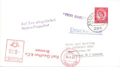 Ein etwas eigenwilliger Beleg: Freistempel der Linienagentur Karl Geuther & Co., Bremen 26. Mai 1966, zusätzlich mit englischer Freimachung und in Bremerhaven am 31.05.66 als Paquebot aufgegeben. Neben dem hier gezeigten Zeilenstempel "Prins Hamlet" wurde auch ein Zeilenstempel "MS Prins Hamlet Harwich - Bremerhaven" an Bord verwendet. |